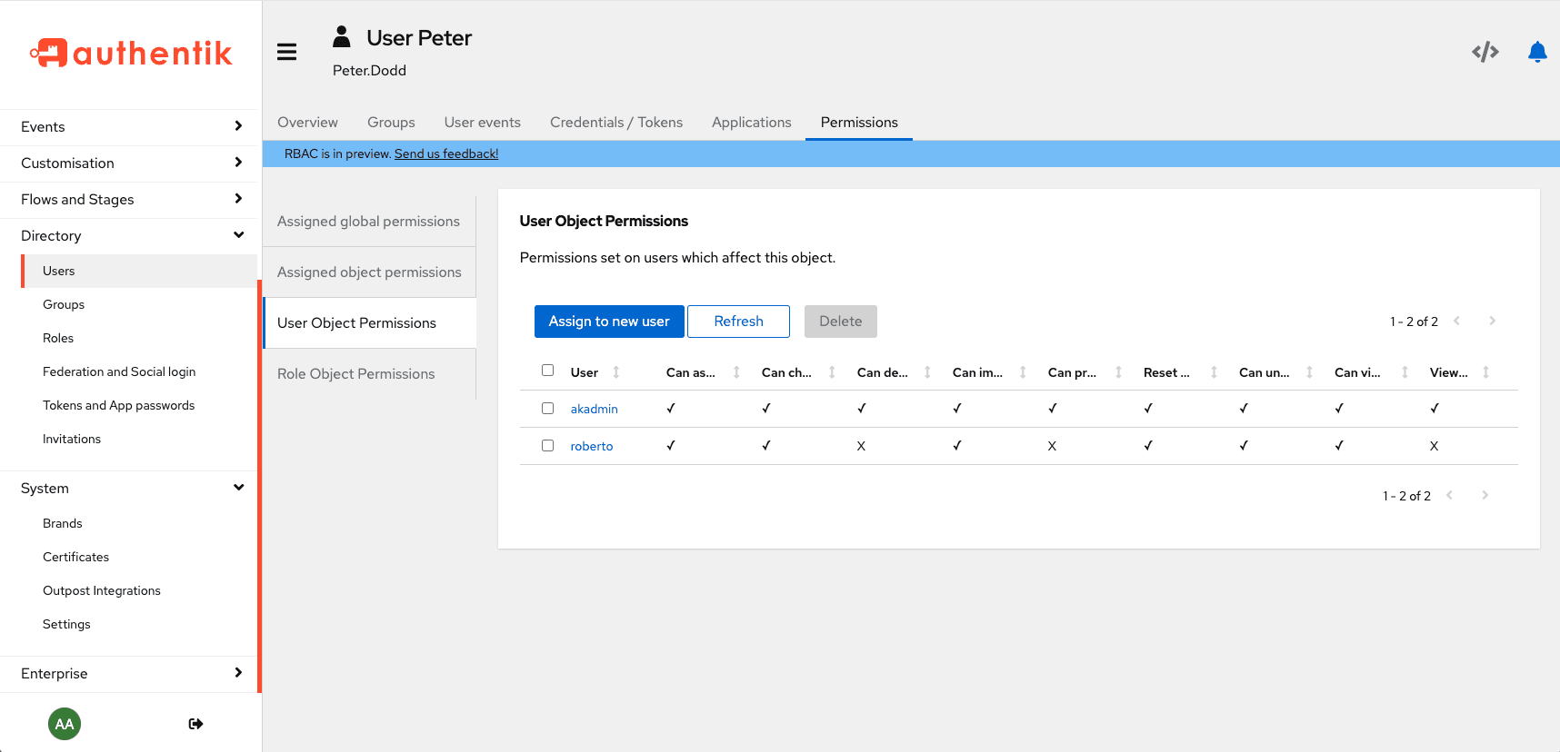 Additionally, authentik employs initial permissions to streamline the process of granting object-level permissions when an object (user or role) is created. This feature enables an Admin to proactively assign specific rights to a user for object creation, as well as for viewing and managing those objects and other objects created by individuals in the same role. For more details, refer to Initial permissions.